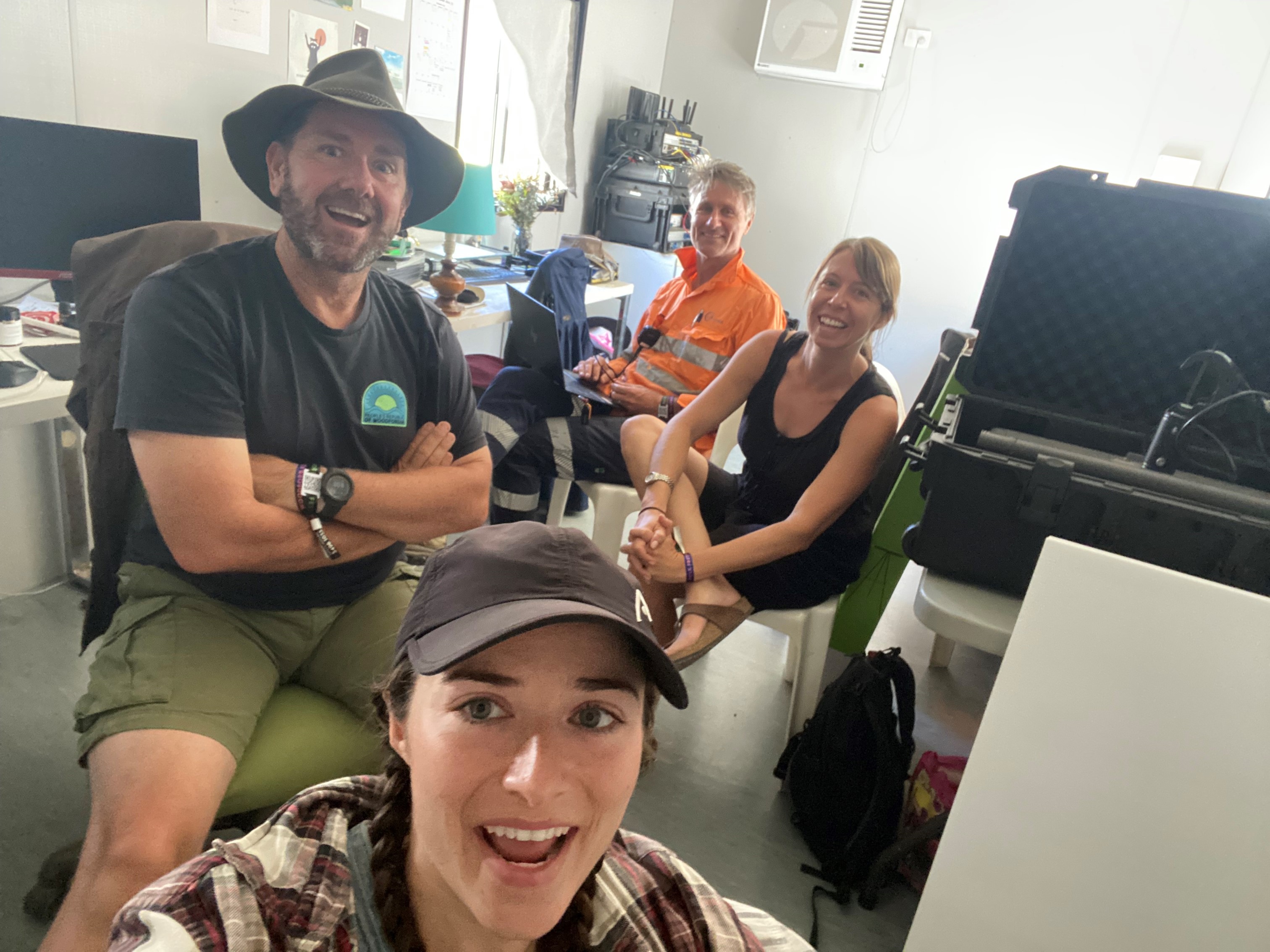 Chris Shervey - Woodfordia Site Manager, Craig Miller - Head of Garbology, Hannah Bennett - PhD Packaging Student and me in our 'rehearsal space' (a shipping container) 2024.